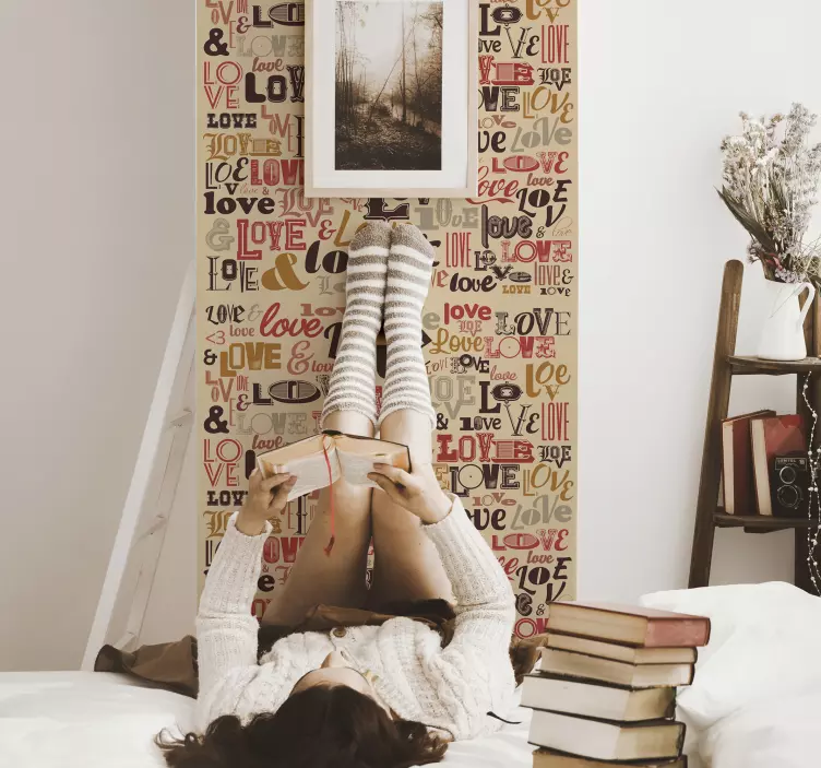 Referência: A44817Uma composição vibrante apresentando várias expressões de amor em diferentes fontes e estilos. A paleta de cores quentes combina vermelhos e tons terrosos, criando uma atmosfera acolhedora e convidativa, perfeita para realçar espaços emocionais.