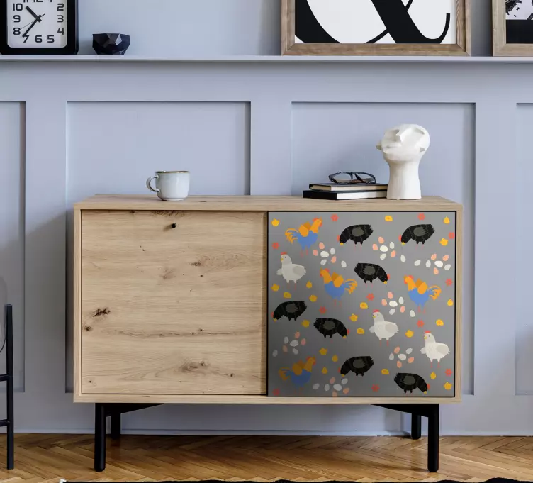 Referência: A52348Uma composição vibrante com vários animais de fazenda, incluindo galinhas coloridas e galinhas pretas, espalhadas sobre um fundo claro. Este design divertido traz uma atmosfera animada, perfeita para adicionar charme a qualquer espaço.