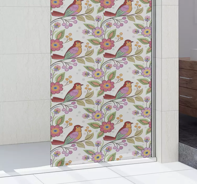 Transforma o teu espaço com o adesivo cabina duche padrão de pássaros coloridos, um design gráfico que mistura a beleza da natureza com a vivacidade das cores! Este autocolante apresenta uma tela de chuveiro repleta de pássaros e flores, trazendo um toque alegre e vibrante para a tua casa. A sua estética colorida e padronizada é perfeita para quem deseja criar um ambiente relaxante e inspirador.