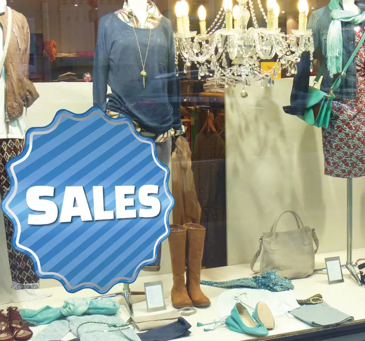 Apresente suas promoções de forma impactante com o adesivo de promoção distintivo de vendas. Com um design gráfico vibrante, que inclui elementos de vendas, saldos e ofertas, este adesivo é ideal para lojas que desejam atrair a atenção dos clientes enquanto fazem compras. As listras azuis e a possibilidade de personalização tornam este adesivo não apenas promocional, mas também uma peça distintiva que se destaca no varejo.