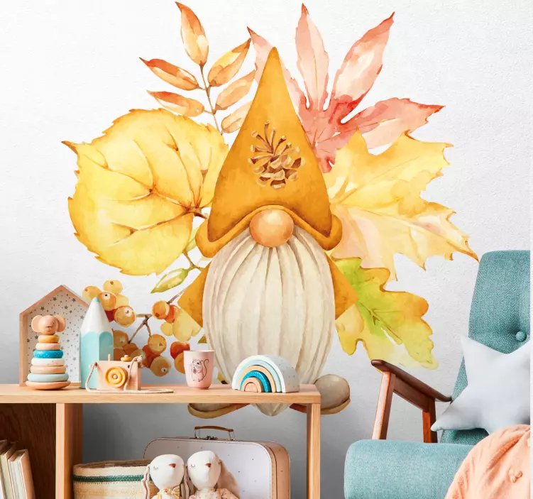 Transforma a tua casa com o adesivo decorativo figura de gnomo de outono, um design gráfico que captura a essência da natureza. Com uma elegante arte em aquarela, este gnomo outonal é rodeado por folhas vibrantes que evocam a beleza da estação. O toque de outono traz uma atmosfera acolhedora e alegre aos teus espaços, tornando cada canto da tua casa um convite à tranquilidade e à beleza natural!
