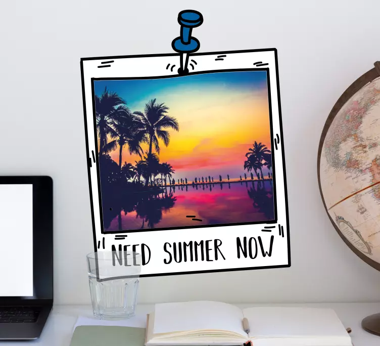 Transforme o teu espaço com o Adesivo natureza moldura de paisagem de verão, um design gráfico que evoca a essência do verão! Com uma estética que remete a uma polaróide de uma praia ao pôr do sol, este adesivo traz a leveza do verão para dentro de casa. Imagine a sensação de estar rodeado por palmeiras enquanto admira a fotografia que retrata as vibes do verão – é como ter uma janela para um destino paradisíaco em cada parede!