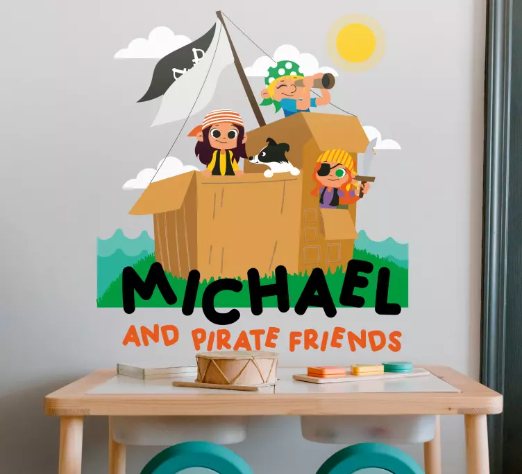Transforma o quarto dos teus pequenos numa verdadeira aventura com o nosso adesivo para crianças cena de aventura pirata! Este divertido design gráfico apresenta um navio pirata navegando por mares desconhecidos, rodeado de amigos piratas prontos para a aventura. Com um estilo de desenho animado, este produto é personalizável, permitindo que os nomes dos pequenos piratas sejam adicionados, tornando cada espaço único e brincalhão!