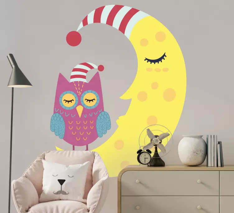 Transforma o quarto dos teus pequenos com o Adesivo para crianças coruja sonolenta luna! Este encantador design gráfico combina a lua e uma coruja adorável, criando uma atmosfera de conto de fadas durante a noite. A coruja adormecida, com seu estilo de desenho animado, traz um toque fofo e colorido ao espaço infantil, ideal para inspirar sonhos tranquilos e noites serenas.