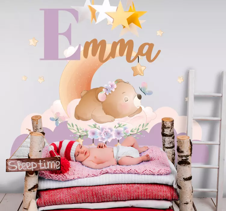 Transforma o quarto do teu bebé com o nosso adesivo para crianças ilustração do urso dormindo, uma peça única que traz à vida um adorável urso Teddy adormecido sob nuvens e estrelas. Este design gráfico encantador permite personalizar o nome do teu pequeno, tornando-o ainda mais especial! A ilustração traz um toque de magia e conforto, ideal para criar um ambiente tranquilo e feliz. É a escolha perfeita para qualquer quarto infantil!