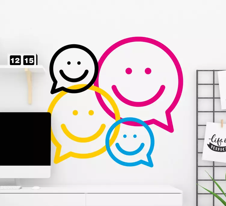 Referência: A49042Uma disposição divertida de rostos sorridentes em tamanhos e cores variados representa alegria e comunicação. Esses ícones alegres, estilizados com balões de fala, evocam emoções e criam uma atmosfera vibrante, perfeita para espaços que buscam inspirar positividade.