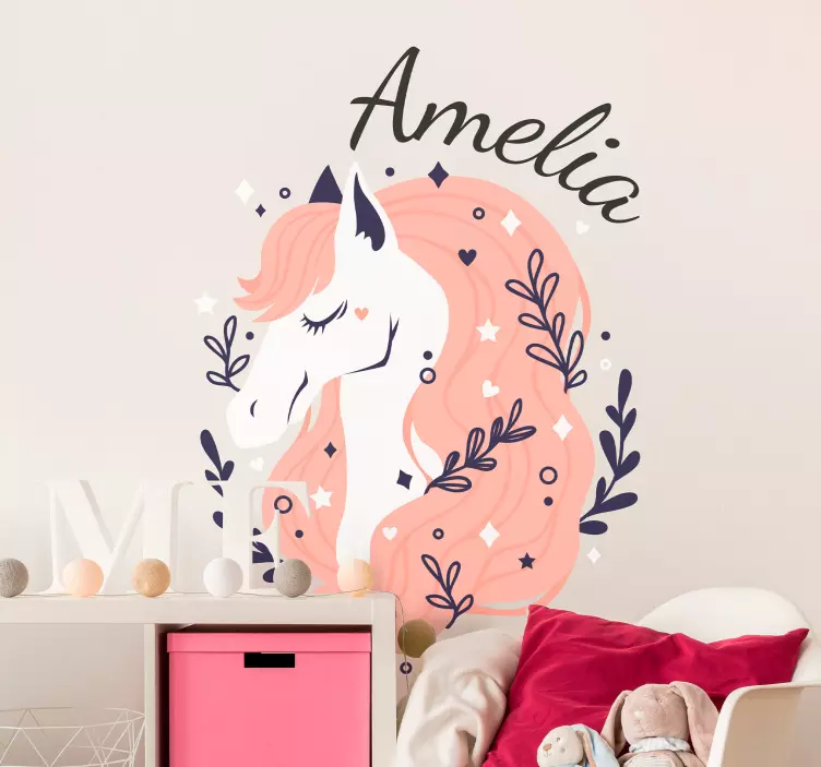 Descobre a magia do autocolante ilustração de unicórnio personalizada, uma peça gráfica única que transforma qualquer espaço! O design caprichoso deste autocolante apresenta um unicórnio adorável, rodeado por um toque floral, ideal para quartos infantis. Com nome, personalizável e uma paleta de cores suaves, este autocolante é a escolha perfeita para quem procura um toque fofa e encantador na decoração. É uma forma divertida de adicionar personalidade e alegria ao ambiente!