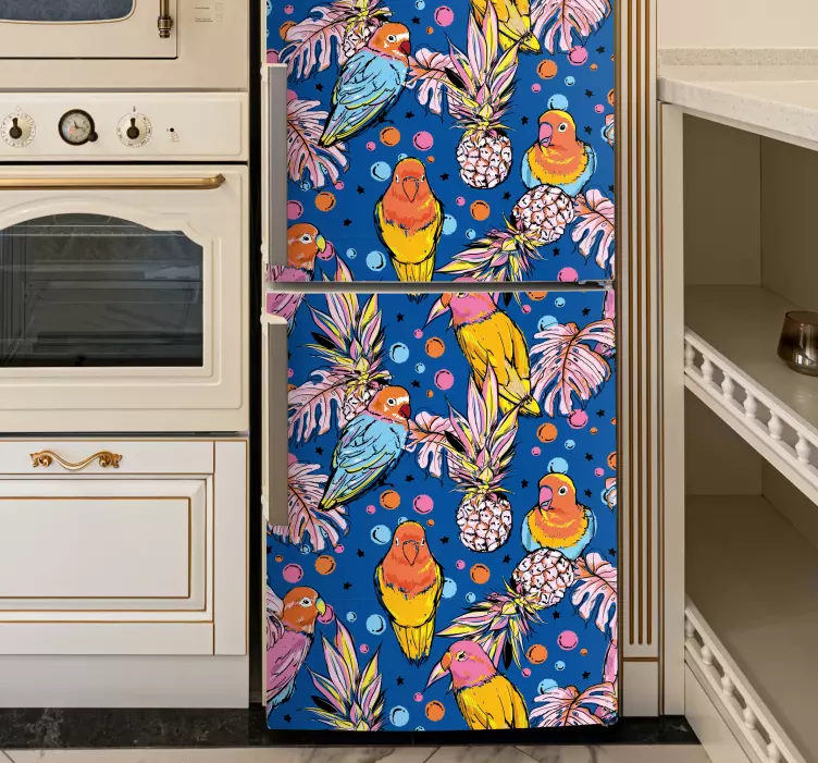 Transforma o teu frigorífico com o nosso Autocolante para frigorífico design de papagaios coloridos! Este design gráfico vibrante traz à tua cozinha a essência tropical, com pássaros e papagaios rodeados por abacaxis, criando um ambiente alegre e colorido. As cores vibrantes fazem com que a natureza ganhe vida na tua casa, tornando o espaço mais acolhedor e divertido!