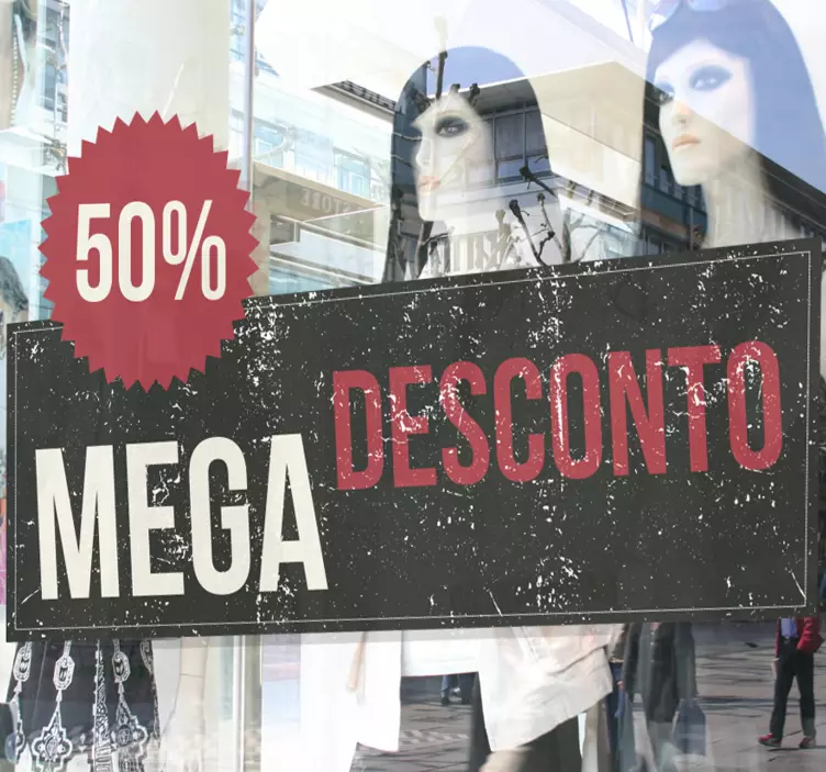 O vinil autocolante de promoções para montras foi criado com um lindo fundo e texto "mega desconto". O design pode ser personalizado com a percentagem desejada. A aplicação é muito fácil e simples, pois é produzido com material de melhor qualidade que não forma bolhas de ar ou rugas. Escolha esse autocolante de vinil para montras de lojas do tamanho que preferir e nós o entregaremos exatamente como aparece aqui. Além disso, pode ser removido da superfície sem deixar manchas ou marcas.