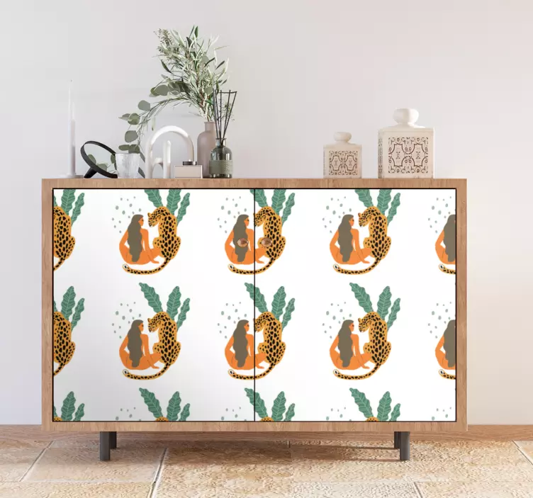 Transforma o teu espaço com o Autocolante para móveis cena de planta leopardo, um design gráfico que combina a elegância da natureza com um toque caprichoso! Este autocolante desenhado à mão apresenta uma mulher rodeada por leopardos e plantas tropicais, criando uma atmosfera única e vibrante. É a escolha perfeita para quem deseja personalizar o mobiliário com um motivo animal, trazendo um casal de leopardos à vida em qualquer ambiente!