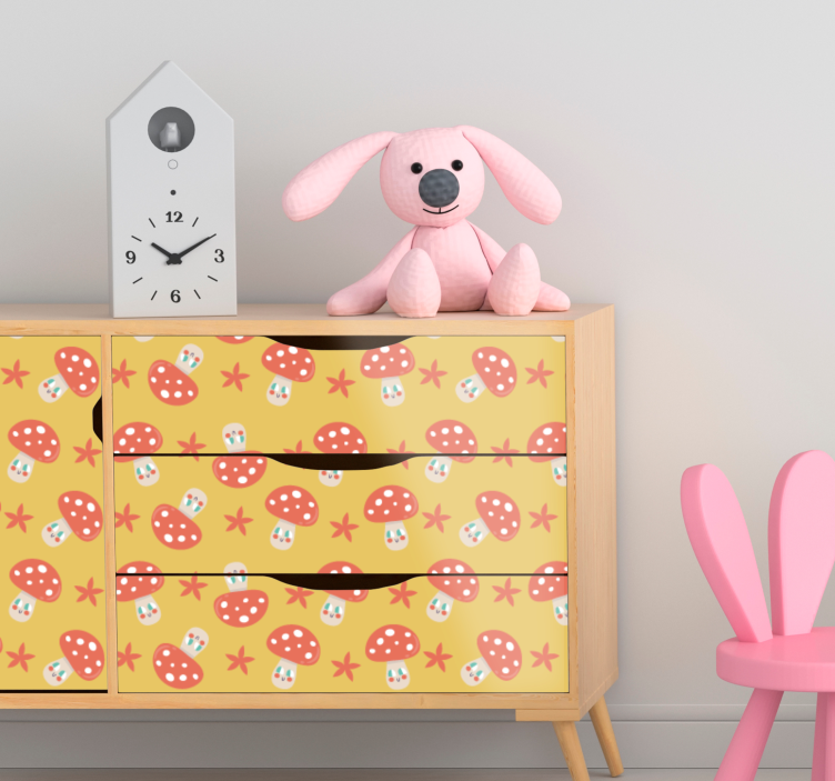O Autocolante para móveis com design de padrão de cogumelos é uma verdadeira obra de arte gráfica! Com elementos como mosca agárica e estrelas, este autocolante traz um toque caprichoso e brincalhão à decoração infantil. O fundo amarelo vibrante destaca os adoráveis cogumelos, tornando qualquer espaço mais alegre e divertido!