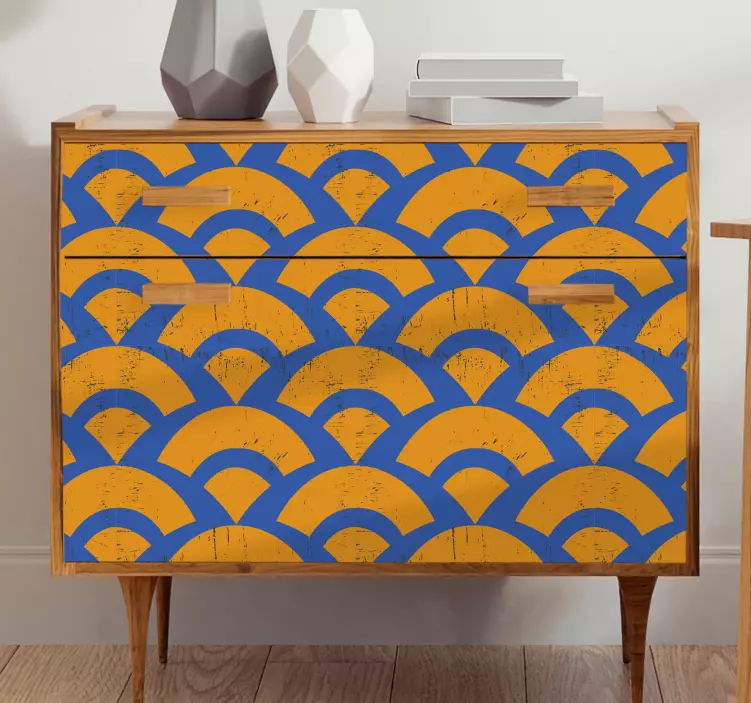 O Autocolante para móveis com padrão de ondas apresenta um design gráfico que se destaca pela sua padronização com arcos geométricos em tons de azul e laranja, criando uma estética minimalista que transforma qualquer ambiente. Este produto é ideal para quem procura dar um toque moderno e elegante ao mobiliário, tornando-o um elemento central da decoração.
