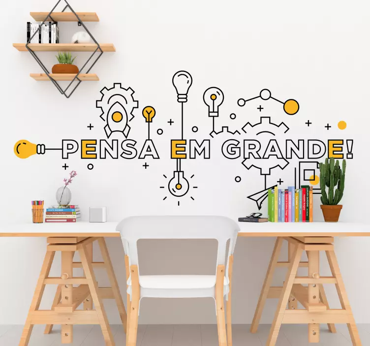 Referência: A15289Donald Trump um dia disse “ Eu gosto de pensar em grande. Se vais estar a pensar em alguma coisa, mais vale pensar em grande.”. O atual presidente dos Estados Unidos têm muito que se lhe diga mas temos de concordar com esta. Se procura um autocolante inspiracional, que o ajude a alcançar o seu potencial máximo este é o perfeito para si! Um adesivo com a frase ilustrada com lâmpadas e peças de uma forma modernista e abstrata. Poderá obter o sticker vinilico em todos os tamanhos.