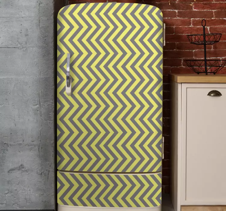 Este autocolante de vinil de linhas em zig zag cinza e amarelo é perfeito para personalizar a porta do seu frigorífico. O padrão em ziguezague cria um efeito de ilusão que adiciona um toque moderno e elegante ao seu espaço.