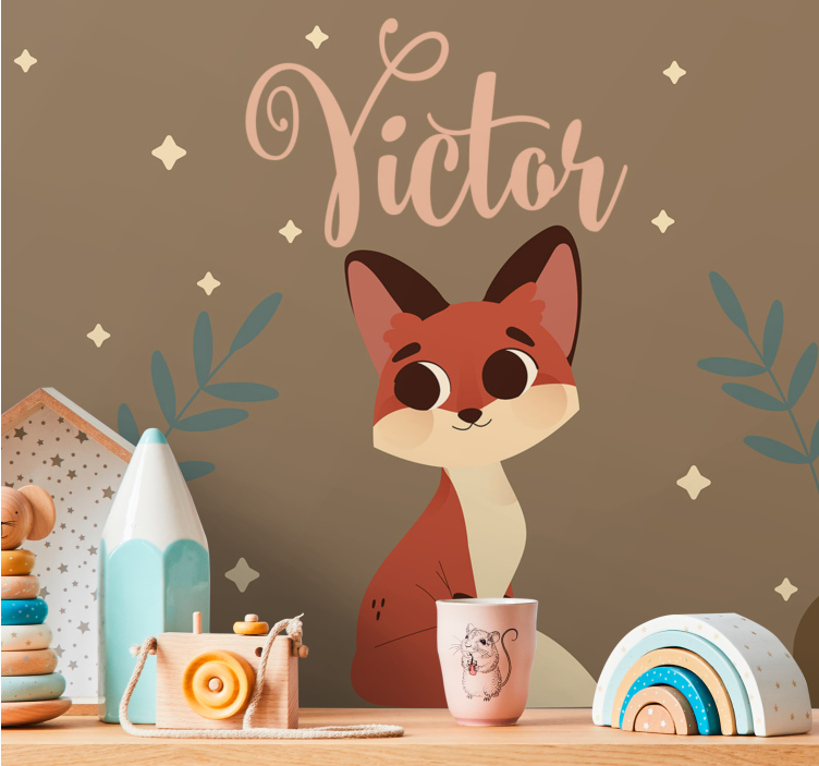 Referência: F9831Um personagem de raposa encantador com olhos grandes e um comportamento brincalhão, cercado por folhagens delicadas e estrelas. O design apresenta o nome 'Victor', adicionando um toque personalizado a este motivo adorável, perfeito para espaços infantis ou áreas lúdicas.