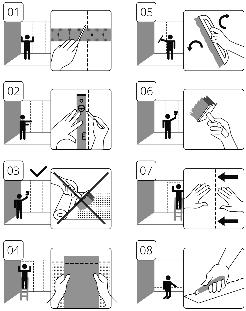 Com um nível e uma régua marque na parede linhas verticais a cada 50cm. Ao longo destas linhas irá aplicar os rolos do papel de parede ou dos fotomurais.