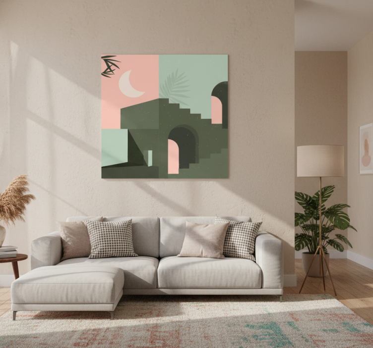 Para aplicar o Poster sala poster para sala com formas em rosa e turquesa, basta escolher um local de destaque na tua sala. A sua instalação é simples e rápida, permitindo que a beleza deste design gráfico se destaque imediatamente. Experimente combiná-lo com outros elementos decorativos para criar um ambiente harmônico e cheio de estilo!