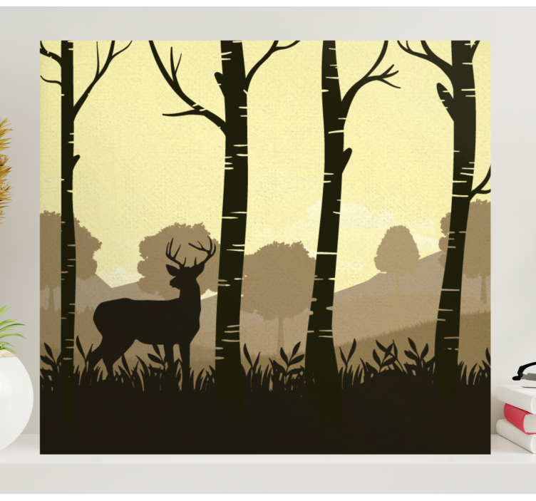 Descobre a beleza da natureza com o nosso quadro com veados silhueta de cervo entre árvores. Este design gráfico é uma verdadeira obra de arte que captura a essência da floresta, onde um majestoso cervo se destaca entre árvores imponentes e relva suave. A combinação de folhagem e animais selvagens cria um cenário perfeito, trazendo a tranquilidade da natureza para o teu espaço!