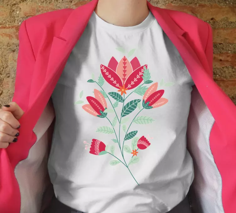 Apresentamos a T-shirt arranjo floral em flor, uma peça que combina o melhor do design gráfico com a essência da natureza. Com um visual que evoca o folclore e as tradições do povo, esta t-shirt é uma celebração da beleza tribal e do artesanal, apresentando flores coloridas que dançam em harmonia. O seu design desenhado à mão traz um toque vibrante, perfeito para a primavera, tornando-a uma escolha ideal para quem aprecia a arte botânica e deseja expressar-se através da moda!