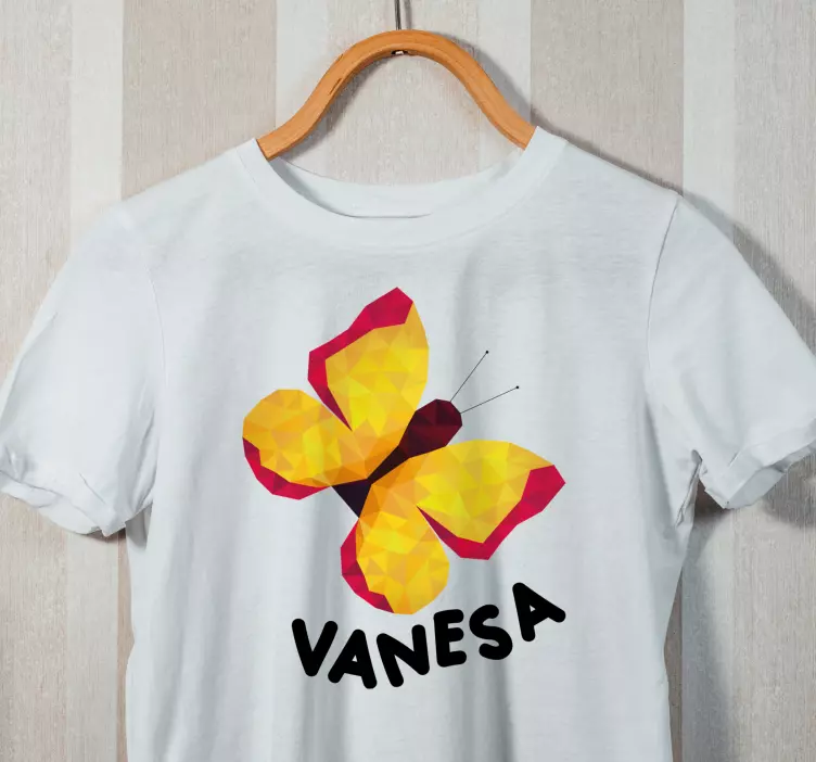 Referência: T4993Este design encantador apresenta uma borboleta vibrante com uma mistura deslumbrante de tons amarelos e vermelhos. As formas geométricas adicionam um toque moderno, enquanto a tipografia ousada do nome realça seu apelo pessoal. Perfeito para transmitir uma atmosfera alegre e brincalhona.