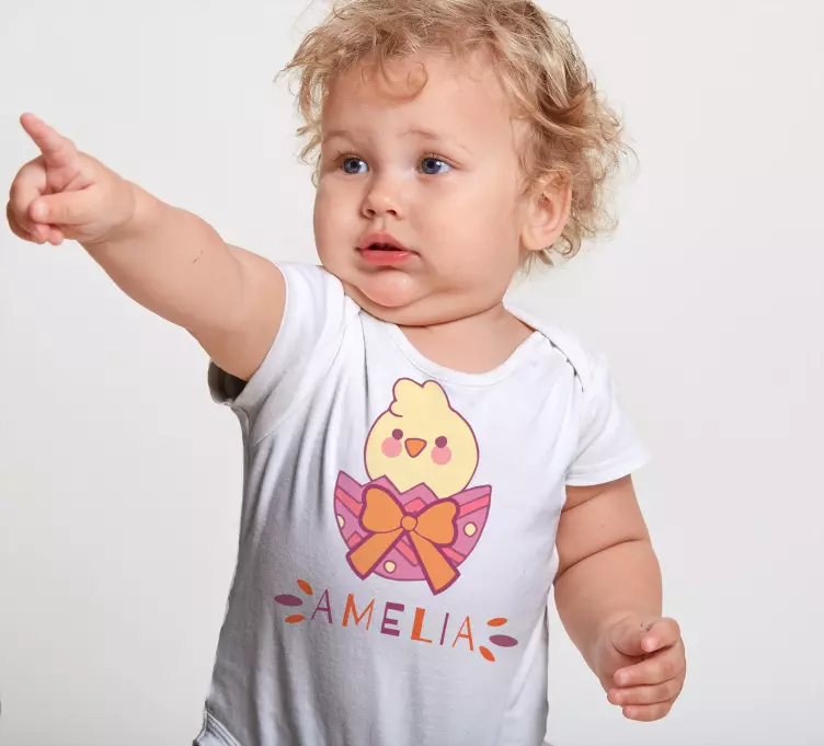 Com um design gráfico encantador, a T-shirt bebé pintinho fofo com laço é uma peça irresistível que vai deixar o teu pequeno ainda mais adorável! Este modelo apresenta um divertido frango com fita, que traz um toque brincalhão e colorido. Personalizável com o nome do bebé, é a escolha perfeita para meninas que adoram um estilo único. O tema do bebê pássaro e do ovo tornam esta t-shirt uma peça cheia de charme e alegria!