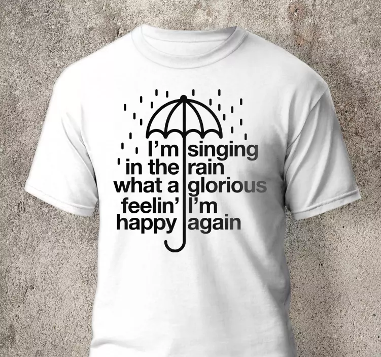 A T-shirt citação do guarda-chuva feliz em dia chuvoso é uma peça única que traz um design gráfico vibrante, onde um guarda-chuva colorido se destaca sob a chuva, complementado por um texto que evoca a letra de uma música cheia de cantorias e sentimentos alegres. Esta t-shirt é perfeita para expressar a alegria mesmo nos dias mais cinzentos, trazendo um toque glorioso ao teu estilo!