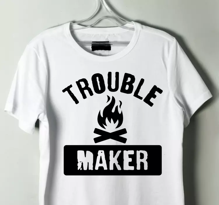 Referência: T5448Este design atraente apresenta um texto em destaque com a frase 'Trouble Maker', acompanhado por símbolos de chama e fogueira. É perfeito para aqueles que abraçam um espírito divertido e aventureiro. O contraste entre o preto e o branco adiciona um elemento de emoção e captura a atenção de forma effortless.