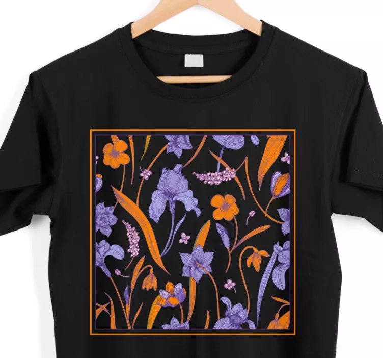 Descobre a T-shirt elegância em padrão floral, uma peça que traz um design gráfico vibrante e encantador! Com uma combinação de açafrão, flores roxas e laranjas, esta arte de flores evoca a beleza da natureza e a alegria da floração. A ilustração colorida e cheia de vida transforma esta t-shirt numa verdadeira celebração das plantas e do estilo pessoal!