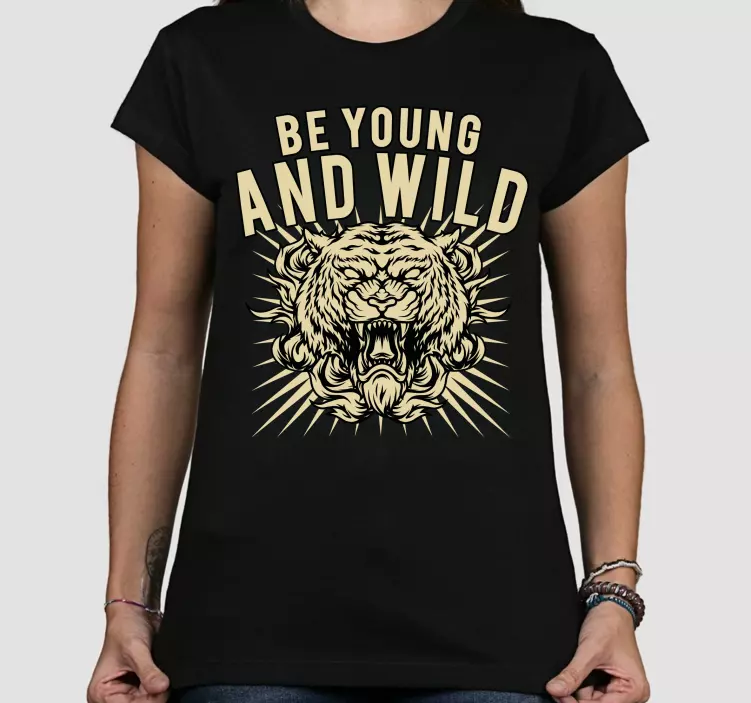 Referência: T4848Este design apresenta uma poderosa cabeça de leão com tipografia ousada destacando a frase 'Be Young and Wild'. A expressão feroz do leão transmite uma sensação de força e aventura, tornando-se uma escolha marcante para indivíduos que desejam expressar seu lado selvagem.