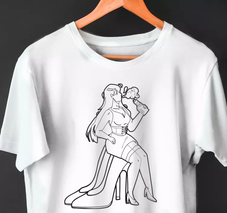 Descobre a T-shirt estilo elegante de salto alto, uma peça que exibe um design gráfico deslumbrante! Com uma ilustração desenhada à mão, esta t-shirt captura a essência de uma mulher confiante, com uma silhueta graciosa e calcanhares que exalam sofisticação. O esboço representa um momento de descontração, onde se pode fumar ou vaporizar um coquetel, tudo isso envolto em uma aura de moda e estilo!