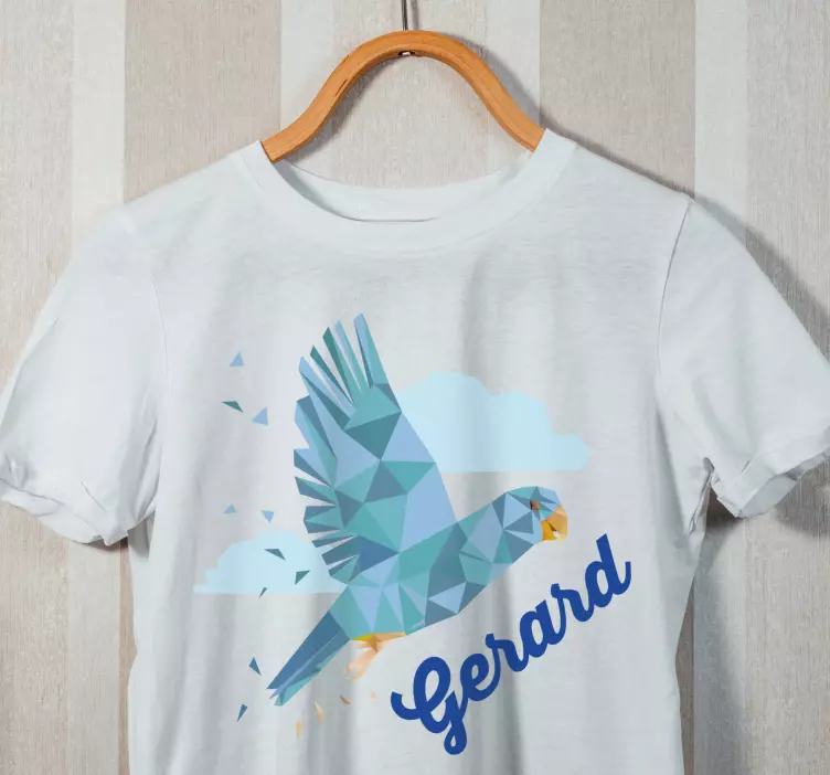 Descobre a T-shirt personalizável pássaro voador estilizado, onde o design gráfico se destaca com um pássaro em vôo, rodeado por nuvens geométricas. Este desenho animado traz à vida a imagem de um papagaio dinâmico, em tons de azul, que pode ser personalizado com um nome de tua escolha. É uma peça única que combina estilo e personalidade!