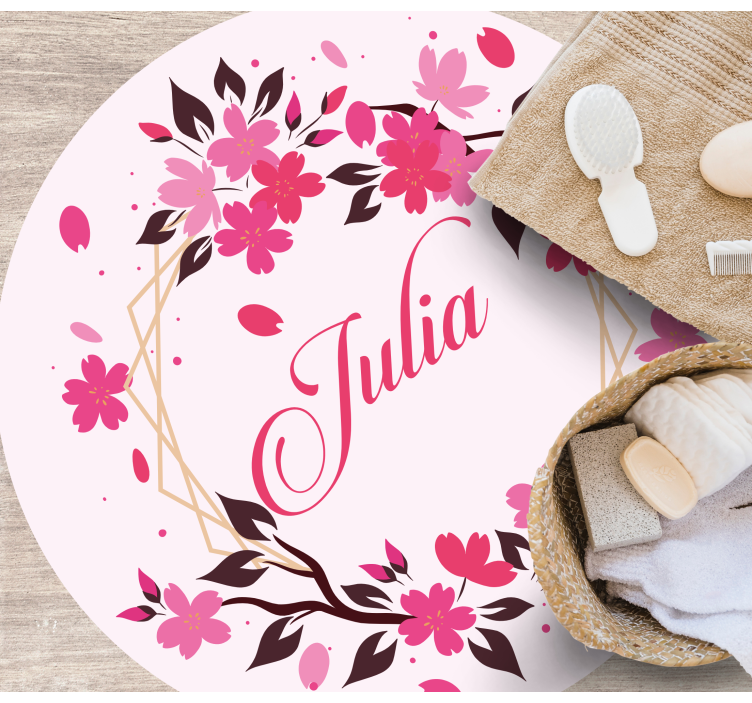 Referência: R5845Lindo tapete circular branco personalizável com uma moldura de flores cor de rosa, pétalas e linhas creme