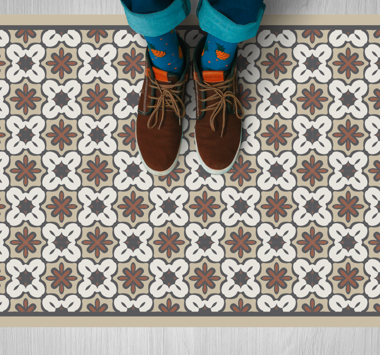 Obtenha este produto e desfrute de todos os elementos únicos que pode utilizar para alterar o aspecto dos seus pavimentos a qualquer momento. Este produto é feito com os melhores materiais que você pode usar para mudar o visual de seus quartos. Aprecie tê-lo com a melhor qualidade que existe. Você pode colocá-lo em sua sala, quarto, casa de banho ou até mesmo na cozinha. Você pode ter aquele padrão de azulejo exclusivo que você sempre quis em qualquer um dos seus pisos e protegê-los ao mesmo tempo. Tapete de vinil com padrão de azulejos de flor marrom e branco.