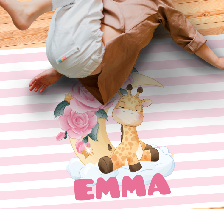 Descobre a alegria de decorar o espaço do teu bebé com o Tapete vinílico para bebés girafa feliz personalizada! Este design gráfico encantador apresenta uma girafa fofa rodeada por flores e nuvens cor de rosa, tornando-o uma escolha perfeita para criar um ambiente acolhedor e divertido. Além de ser customizável com o nome do teu pequeno, este tapete é ideal para estimular a imaginação e o desenvolvimento dos bebés!