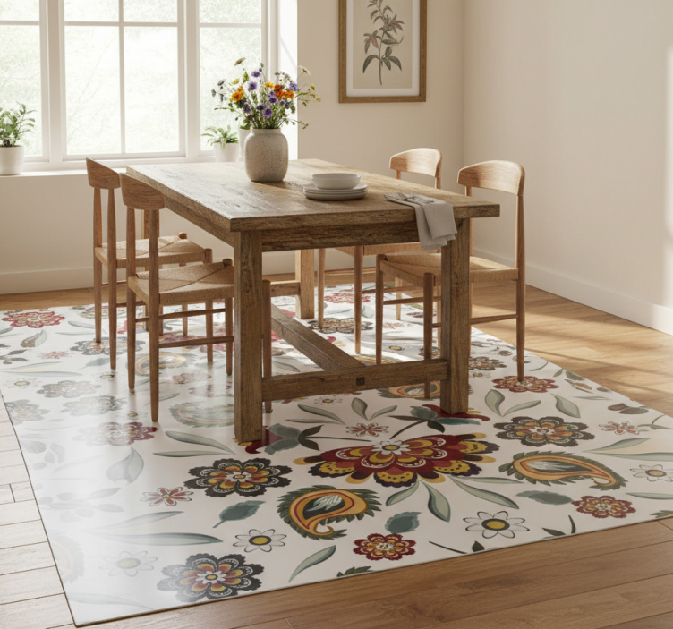 Cuidar do Tapete vinílico flores e plantas estilo floral étnico é muito simples! Basta utilizar um pano úmido com um detergente suave para manter suas cores vibrantes e sua beleza intacta. A sua superfície facilita a limpeza e garante que o ambiente continue sempre agradável e acolhedor.